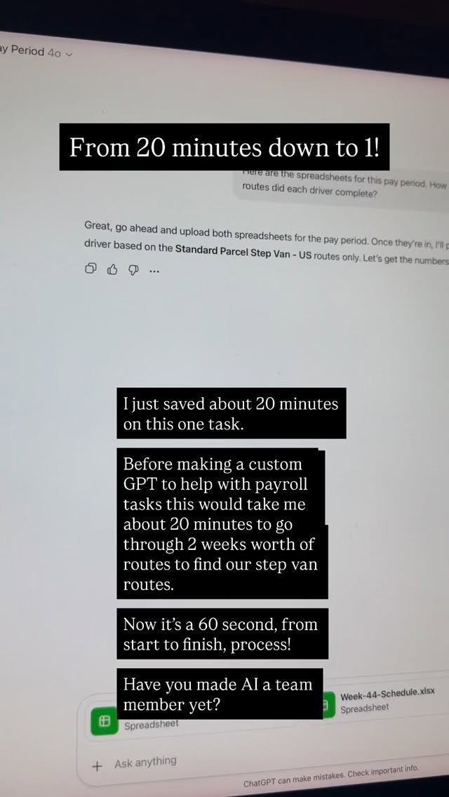 Fleet Insurance Comparison (Logistics Business) Before AI: 2 hours of line-by-line, VIN-by-VIN comparison After AI: Under 1 minute with a custom GPT Result: Caught vehicles we were being charged for that we no longer owned, saved thousands in unnecessary insurance costs